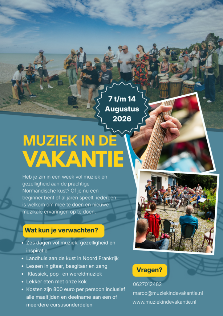Heb je zin in een week vol muziek en gezelligheid aan de prachtige Normandische kust? Of je nu een beginner bent of al jaren speelt, iedereen is welkom om mee te doen en nieuwe muzikale ervaringen op te doen.